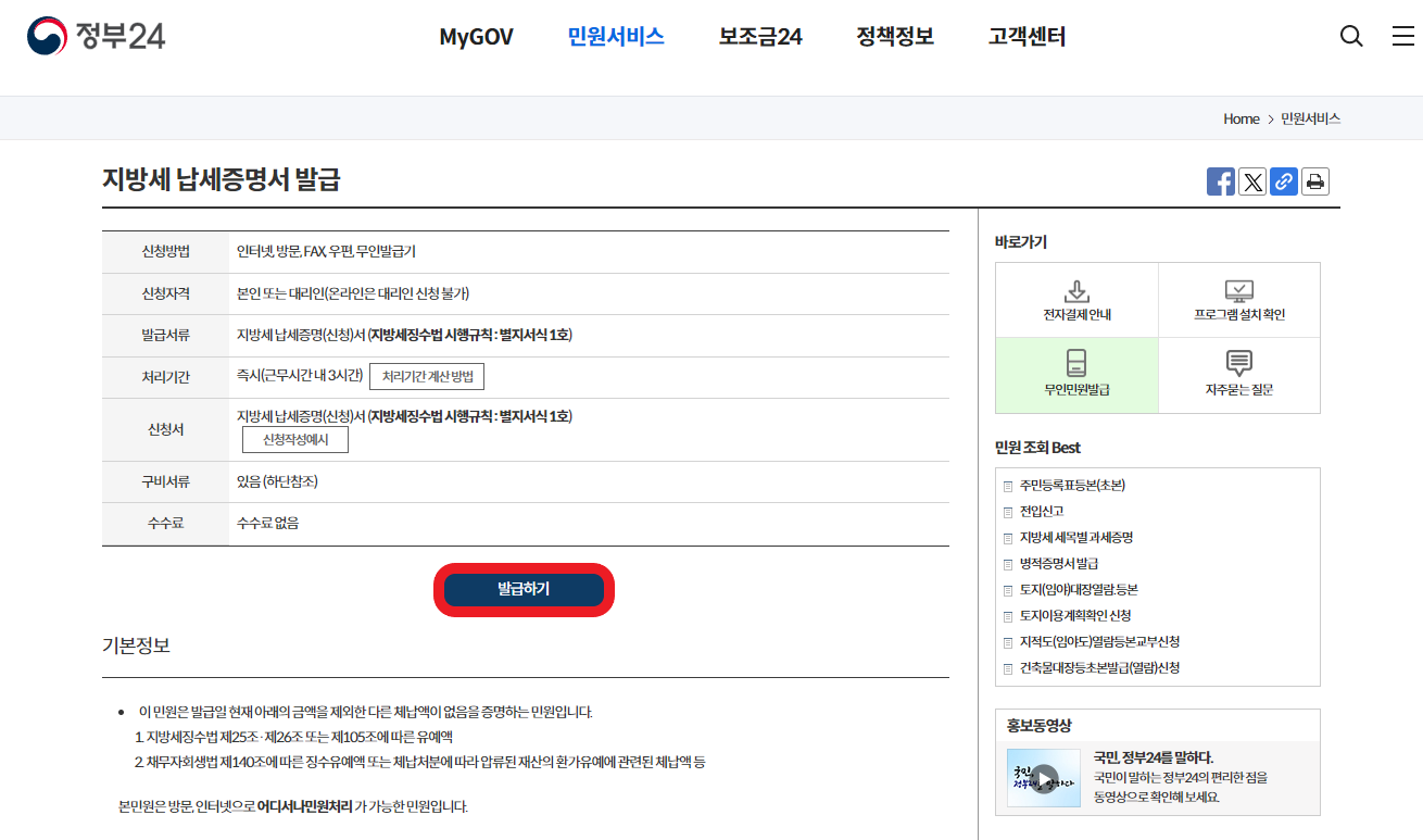 2. 지방세 납세증명서 발급하기 버튼을 클릭한다.