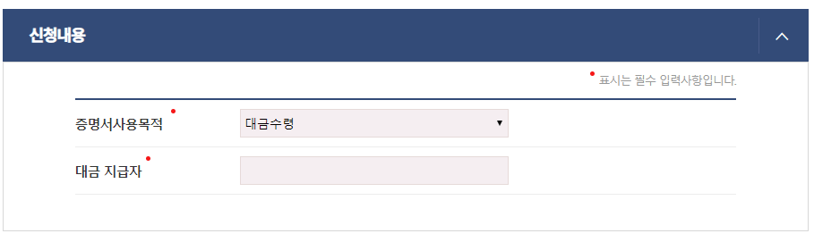 5. 증명서사용목적이 무엇인지 선택하고, 대금 지급자를 입력한다.
