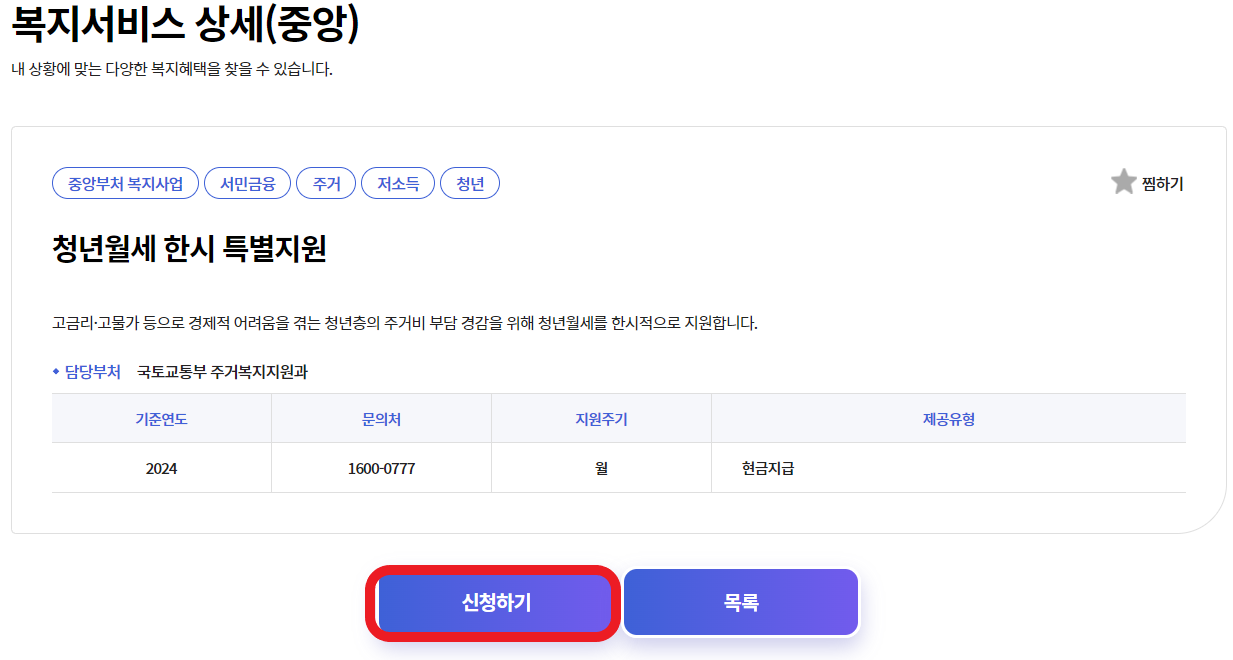 2. 청년월세 한시 특별지원 창에서 신청하기 버튼을 클릭한다.