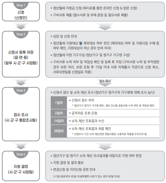 ① 먼저 신청인이 청년월세 지원금을 신청하기 위해서 온라인신청 또는 방문신청을 한다. 신청을 하면서 필요한 서류들도 같이 제출한다.