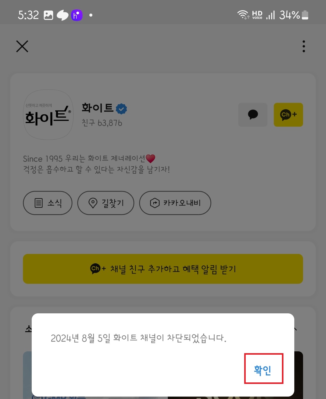 7. "오늘자로 채널이 차단되었습니다."라는 문구가 나타나면 확인을 눌러 완료가 되었음을 알 수 있다.