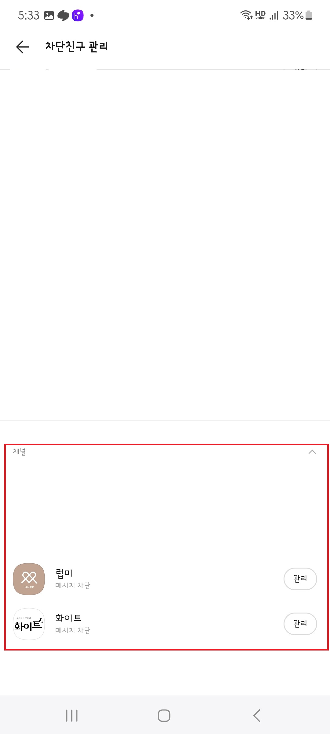 3. 채널에서 내가 차단을 한 채팅방이 있는지 확인한다. 메시지 차단이라고 되어있다면 차단이 제대로 잘 된 것이다.