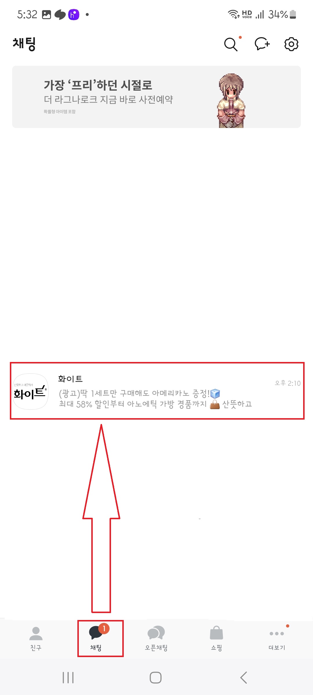 2. 하단에 채팅 탭을 클릭한 후 광고 차단을 원하는 채팅방을 클릭해준다.