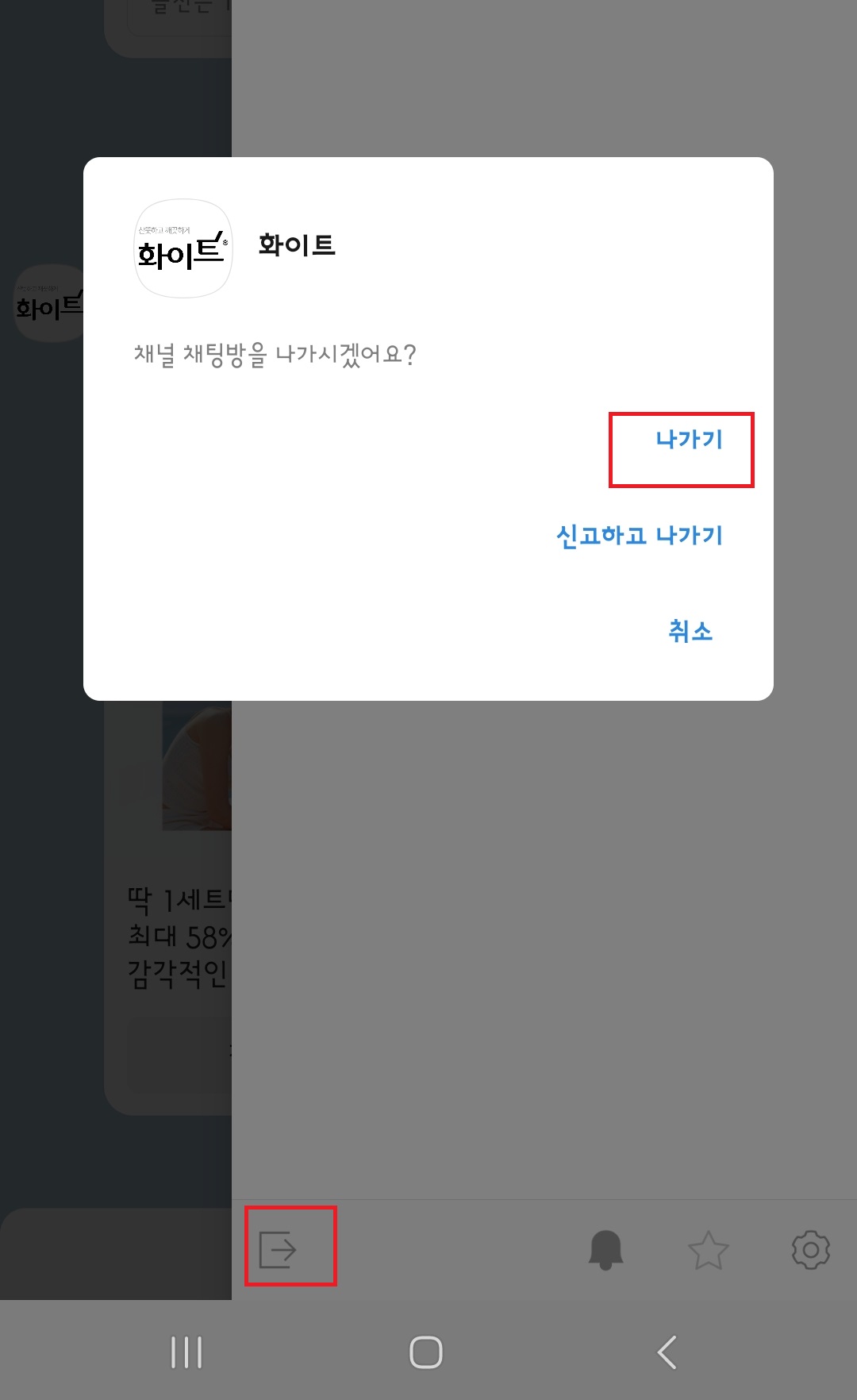 8. 하단에 나가기 버튼을 클릭하면 불필요한 광고 채팅방이 남아있는 것을 없앨 수 있으니 채팅방을 나가면 된다.