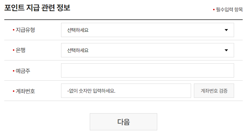 ⑥ 포인트 지급 관련 정보를 입력해준다. 계좌로 입금을 원하면 은행, 예금주, 계좌번호를 입력하고 카드 포인트로 입금을 원하면 카드와 카드사를 입력해준다.