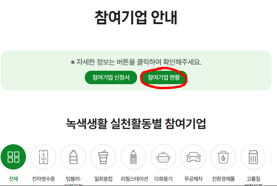 녹색생활 실천활동별 참여기업은 아래 버튼을 클릭하면 확인할 수 있다.