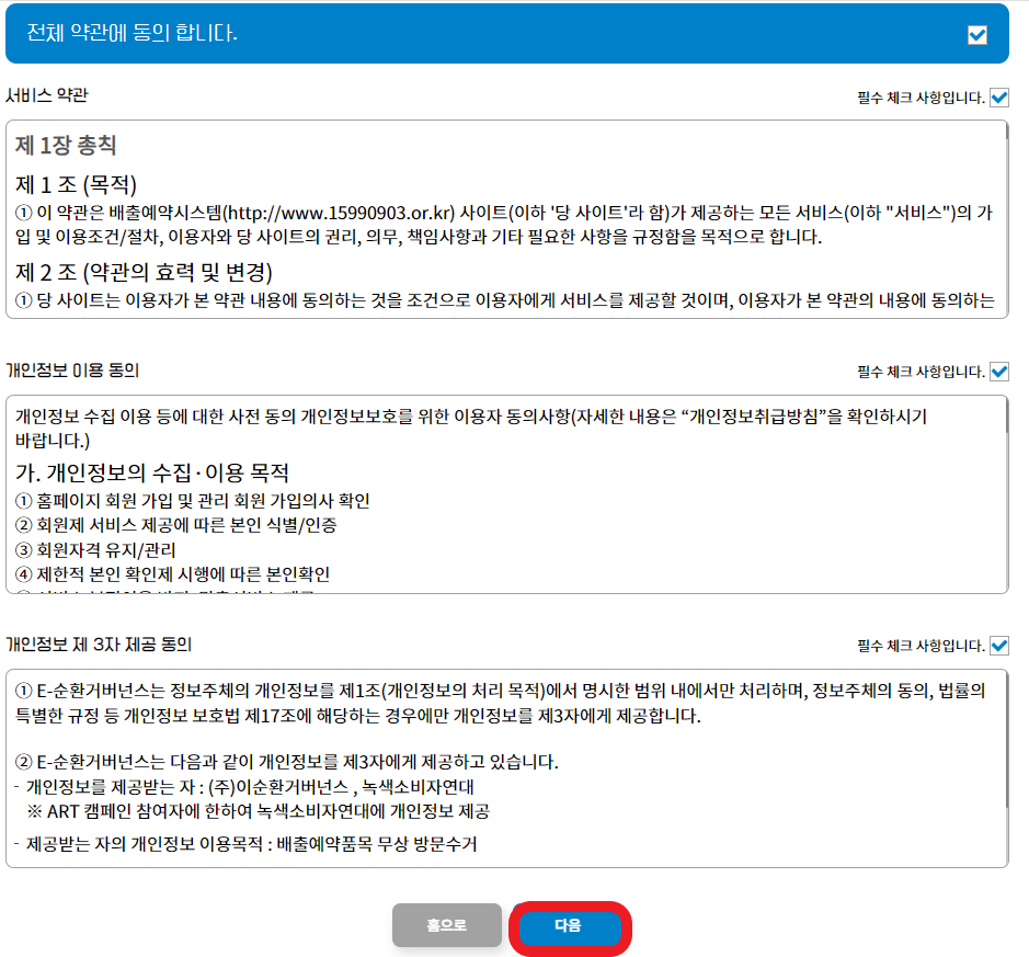 3. 전체 약관을 읽어보고 동의한 후, 다음 버튼을 클릭한다.