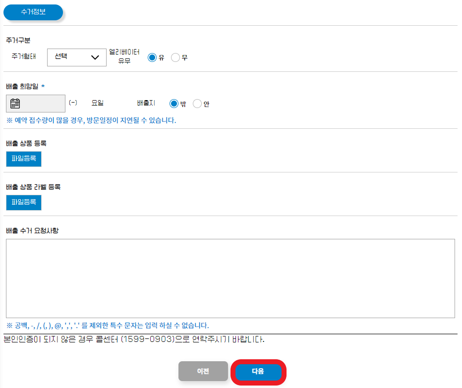 5. 고객명, 휴대폰번호, 주소, 수거정보 등을 입력한 후 다음 버튼을 클릭하면 신청이 완료된다.