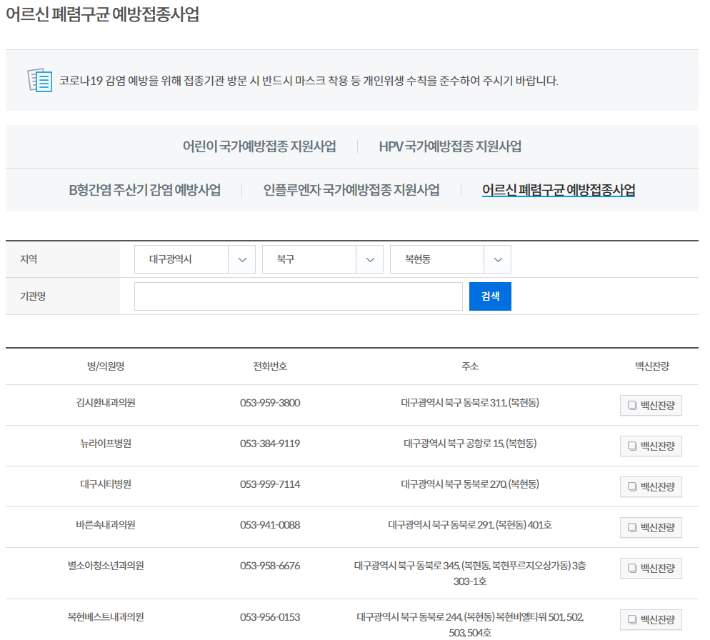 2. 자신이 원하는 지역을 입력하고 검색 버튼을 클릭하면 예방접종이 가능한 병/의원명이 나타난다.