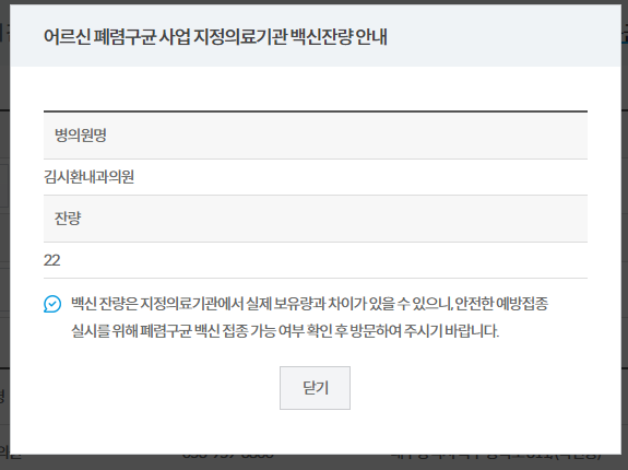 3. 옆에 백신잔량을 클릭하면 백신잔량이 얼마나 남았는지도 확인할 수 있다. 65세 이상 어르신분들의 경우 1회 무료로 맞을 수 있기 때문에 미리 의원에 연락하여 예약하고 접종을 받으면 되겠다.
