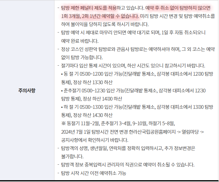 한라산 탐방 예약할 때 주의사항이 있는데 예약 후 취소없이 탐방하지 않으면 페널티 제도를 적용하고 있으니 혹시라도 못가게 된다면 반드시 취소를 하는 것이 좋다.