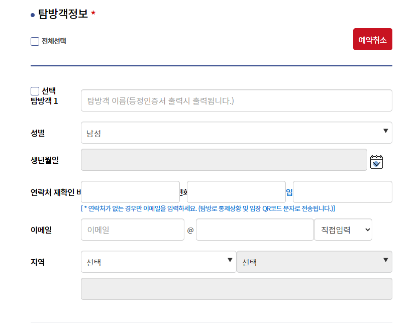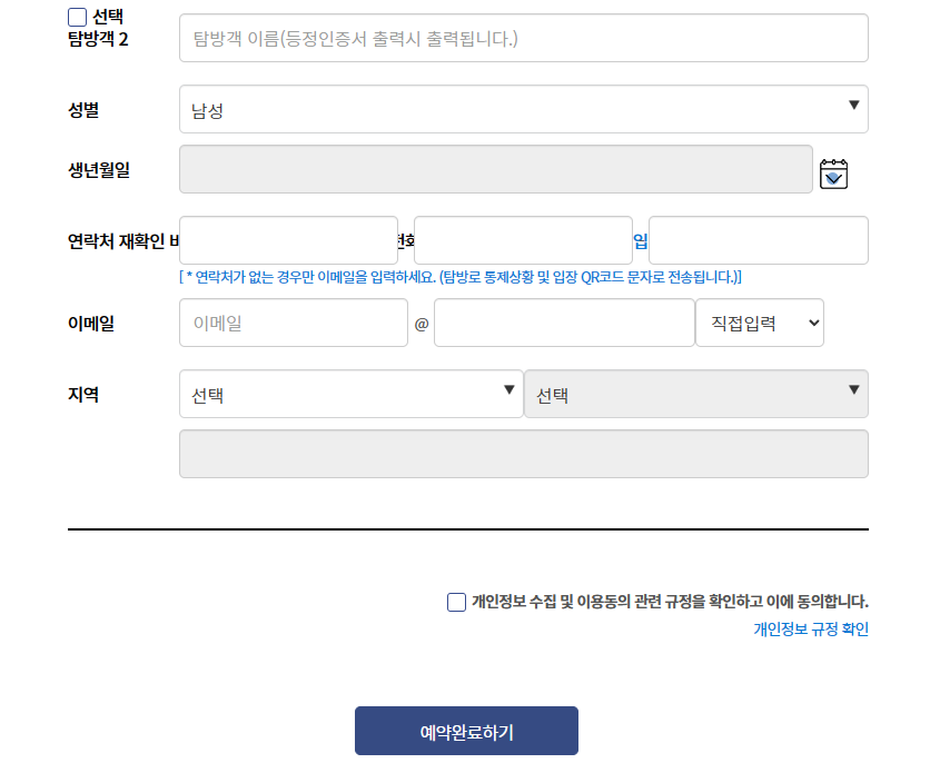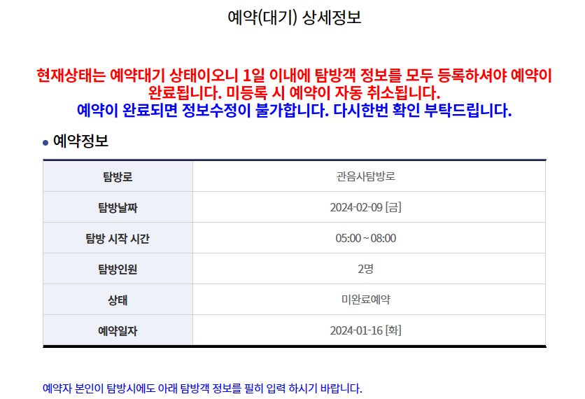 예약 정보를 다 입력하고 넘어가면 예약(대기) 상세정보 창이 뜨는데 예약이 완전히 된 것이 아니기 때문에 반드시 탐방객의 정보를 다 입력해야 예약완료상태가 된다. (본인 포함 가는 사람들 모두 다)