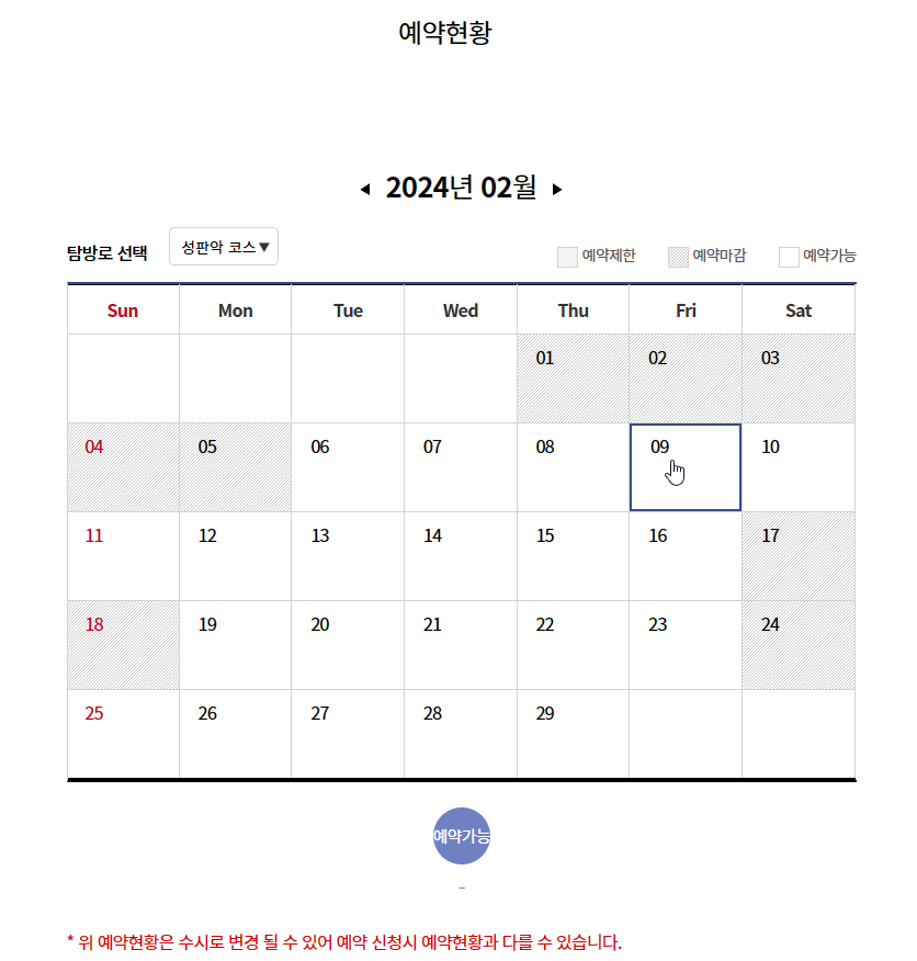 회색으로 빗금 처리 되어 있는 것은 예약이 마감된 것이기 때문에 예약이 불가능하고 연한 회색으로 칠해져있는 날짜는 예약제한이기 때문에 예약이 불가능하다. 예약이 가능한 날짜는 위와 같이 손모양 커서로 선택이 가능하다. 주말은 보통 빨리 마감되므로 한 달 전에 미리 예약하는 것이 가장 좋다.