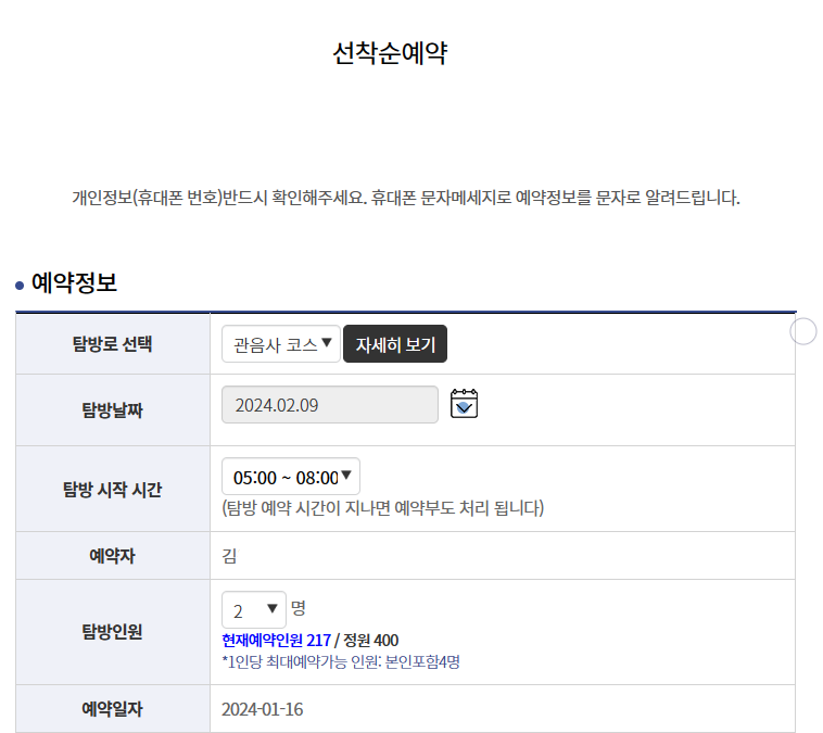 원하는 코스(성판악/관음사)와 날짜 인원을 체크하고 예약하기를 누른다.