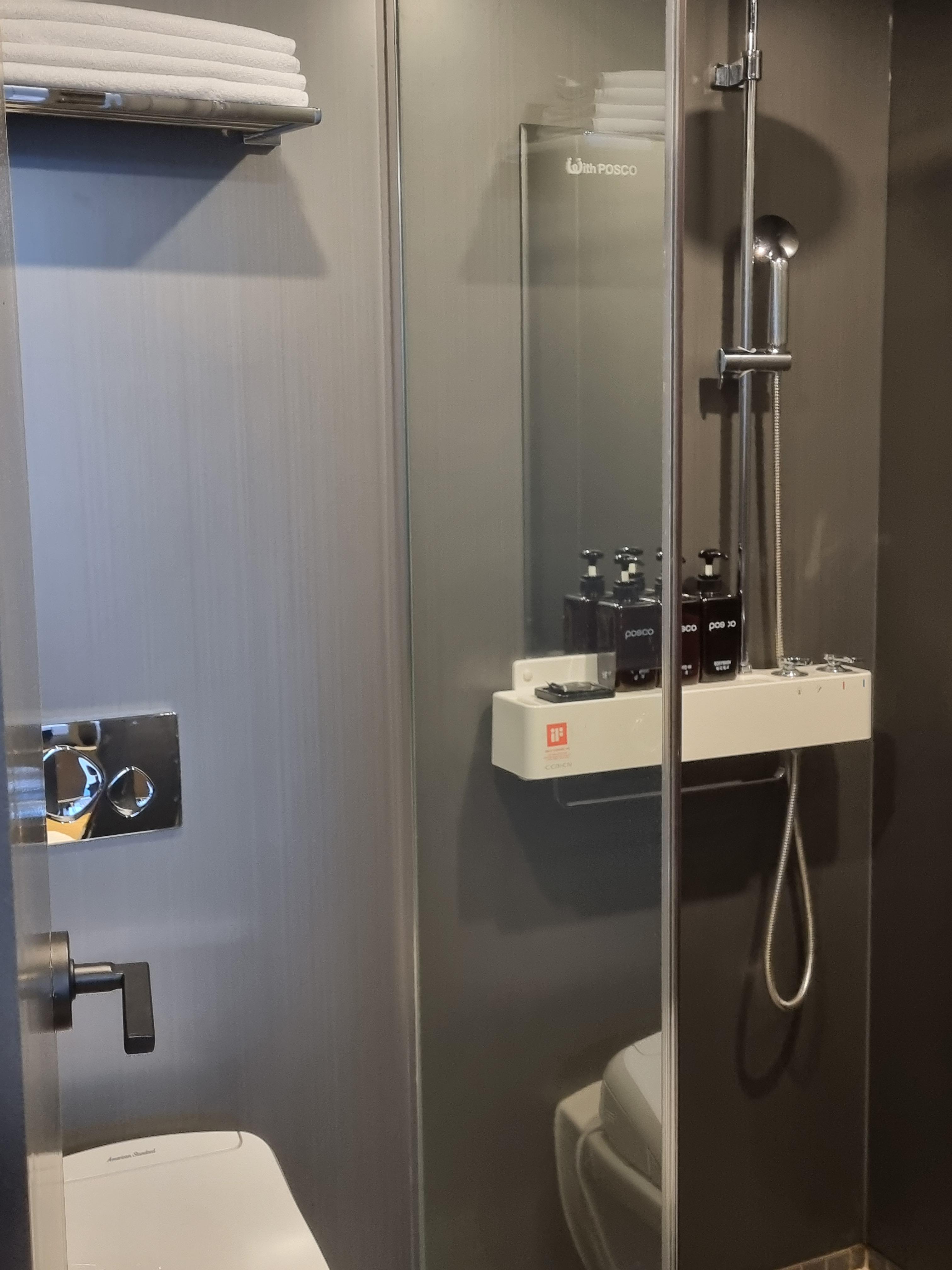 화장실은 조금 좁다. 수건 4개, 샴푸, 컨디셔너, 바디워시 이렇게 있음.