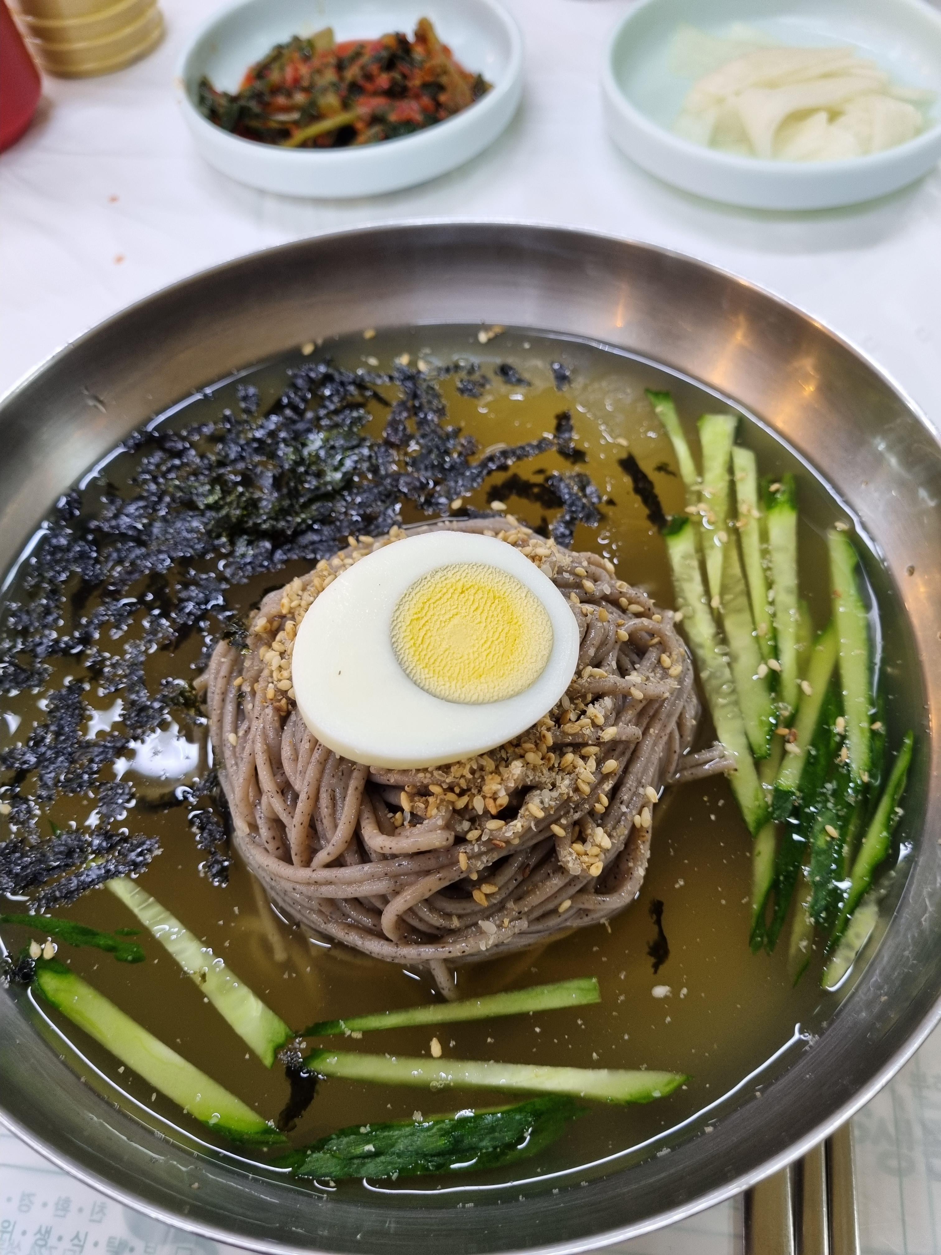 메밀면 특유의 뚝뚝 끊기는 느낌이 났고(메밀면 100프로인가?) 씹으면 씹을수록 고소한 맛이 올라온다.