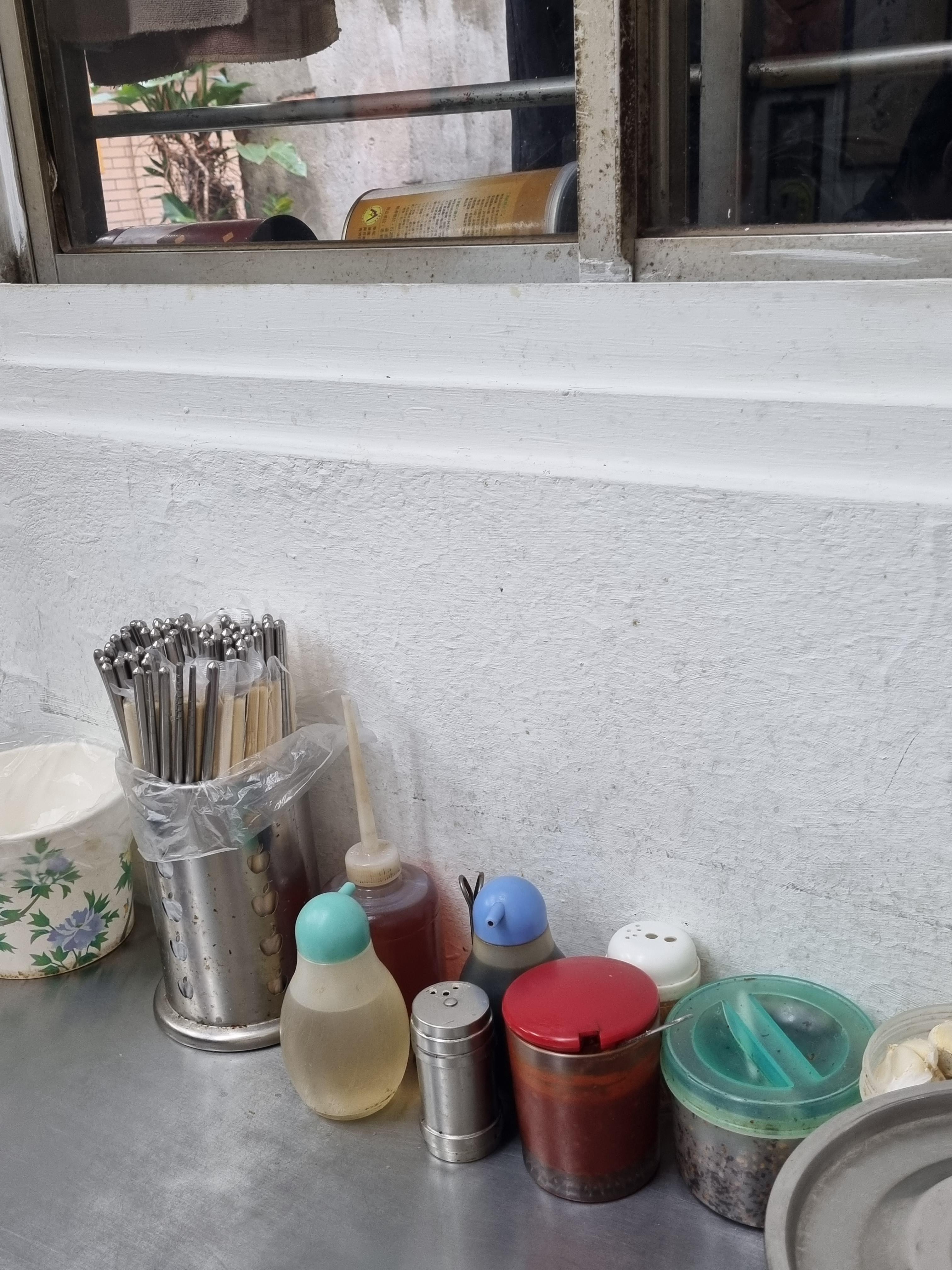 각 테이블마다 고추 기름이랑 우거지랑 매운소스랑 마늘 등등이 있다