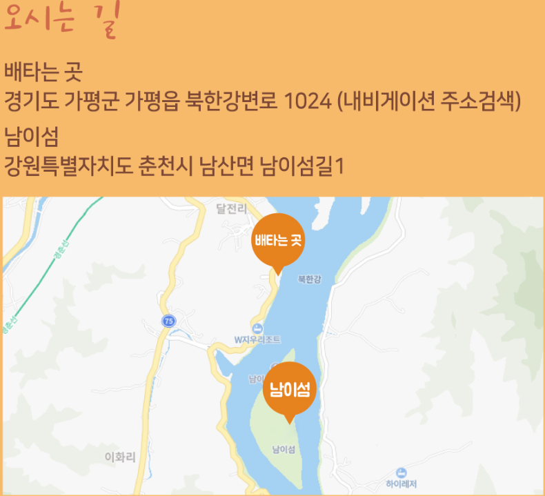 - 내비게이션에 주소 검색 : 경기도 가평군 가평읍 북한강변로 1024(남이섬 매표소 / 남이섬 선착장)을 치고 오면 된다.