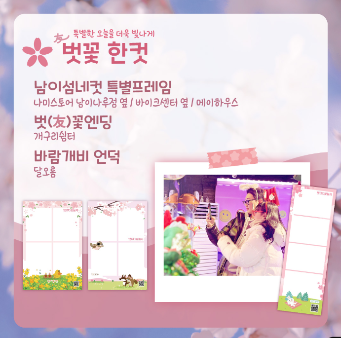 인생네컷을 많이 찍으시는 분들은 남이섬네컷 특별프레임도 마련되어 있으니 추억사진을 남기기에도 좋다. 남이섬네컷 특별프레임은 나미스토어 남이나루점 옆, 바이크센터 옆, 메이하우스에 준비되어있다.