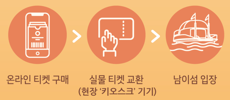 남이섬에 방문하시려면 선박을 타고 들어오셔야 한다. 남이섬은 춘천에 위치해 있지만 선박을 타는 곳은 경기도 가평군에 위치해 있으니 헷갈리지 않도록 유의해야 한다.