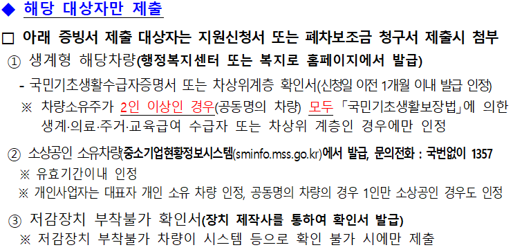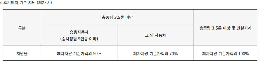 폐차기한은 대상자 통보일로부터 2개월 이내이며 수출, 멸실, 환가가치차령초과 등의 말소등록 차량은 보조금 지급이 불가하니 참고하자.