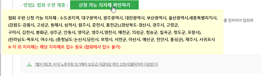아래 버튼을 클릭하면 조기폐차 수도권 폐차업체를 확인할 수 있다. (지방의 경우 지자체 공고문에 표기된 업체를 확인하면 되겠다.)