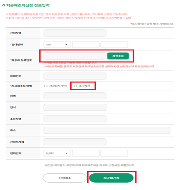 ④ 저공해조치신청 정보를 입력해준다. 차량번호를 기재한 후 차량조회를 클릭해주고 저공해조치 방법은 조기폐차를 클릭해준다.