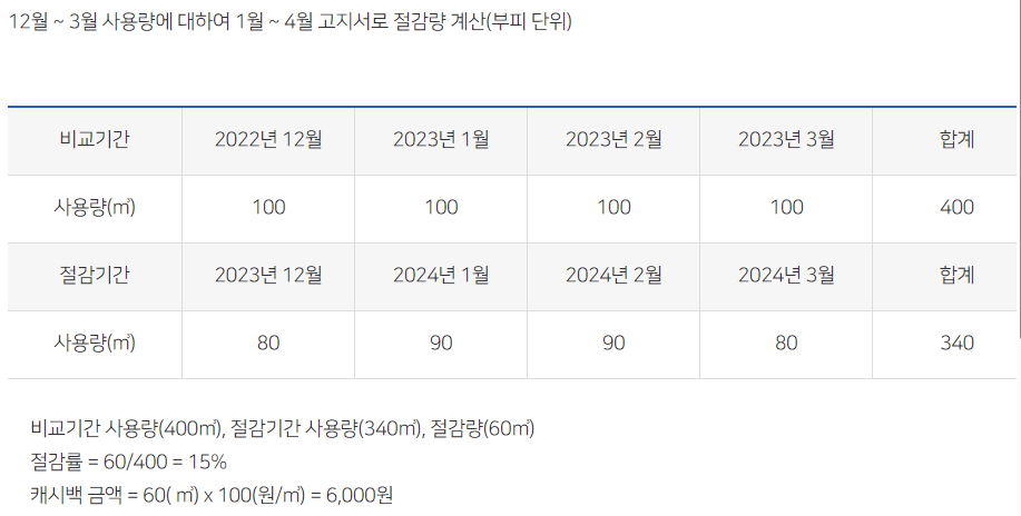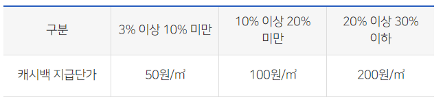 전년 동기간 대비 3% 이상 절감 시 절감율별 차등으로 지급한다. 절감율이 높을수록 캐시백 지급단가가 높아진다.