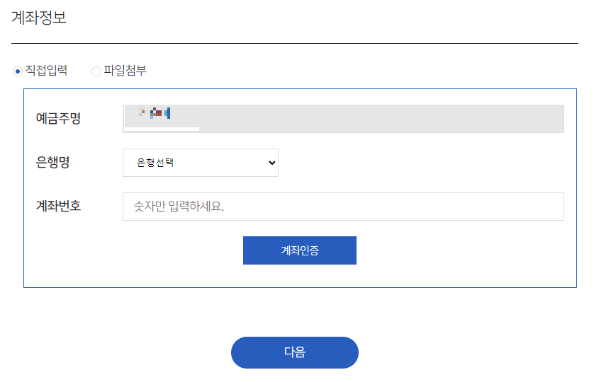 9. 계좌정보인 예금주명, 은행명, 계좌번호를 입력해준다.