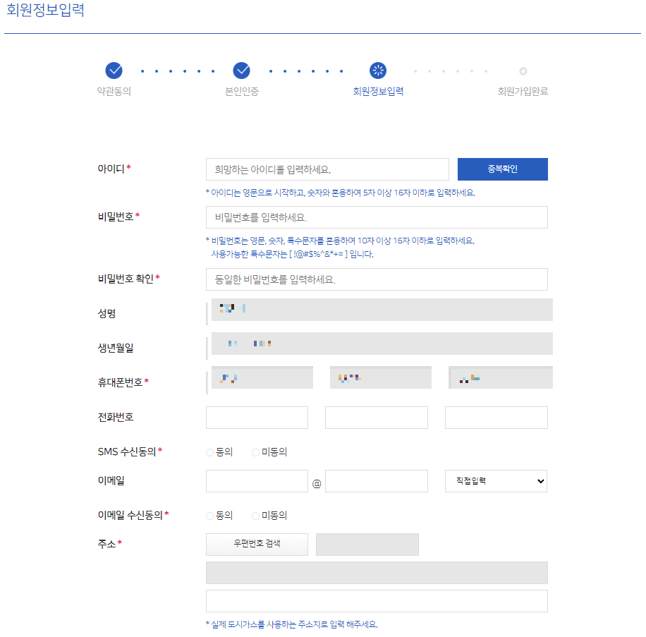 6. 회원정보를 입력해준다. 아이디, 비밀번호, 실제 도시가스를 사용하는 주소지를 입력해준다.