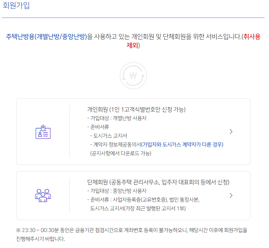 단체회원은 중앙난방 사용자로 개별 가구가 신청하는게 아닌 관리사무소나 입주자 대표회의 등에서 신청 가능하다.