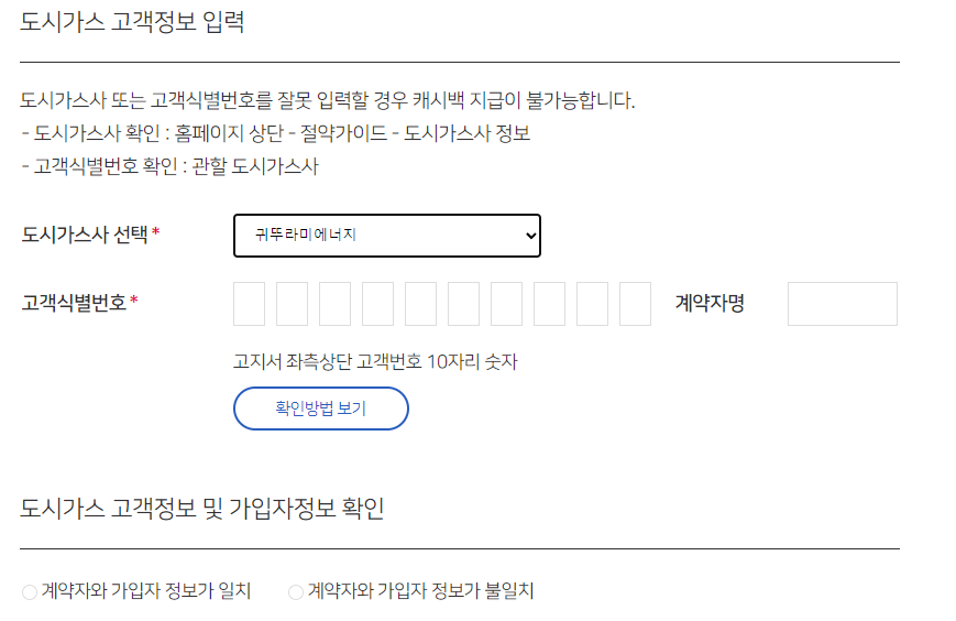 8. 도시가스사를 선택하고나면 고객식별번호 입력하는 칸이 나온다. 고객식별번호는 고지서에 고객번호라고 나와있다. 잘 모를경우 '확인방법 보기' 버튼을 클릭하면 고지서 예시가 나오니 참고하면 된다.