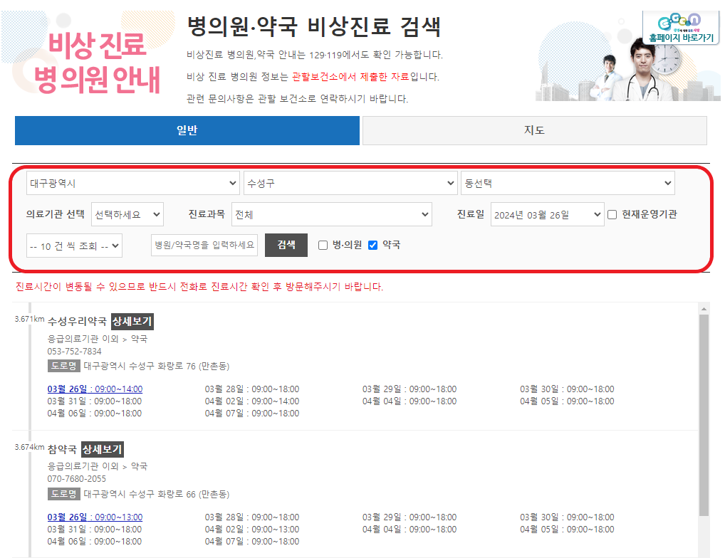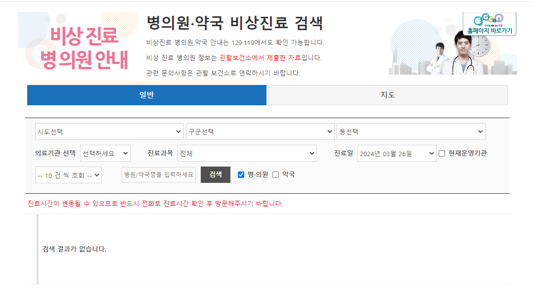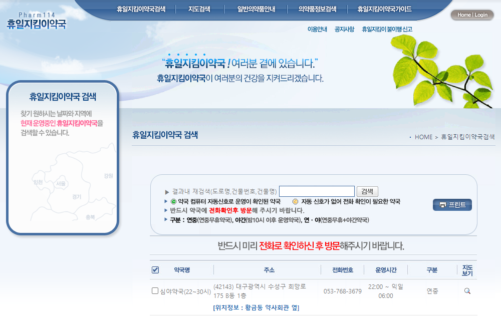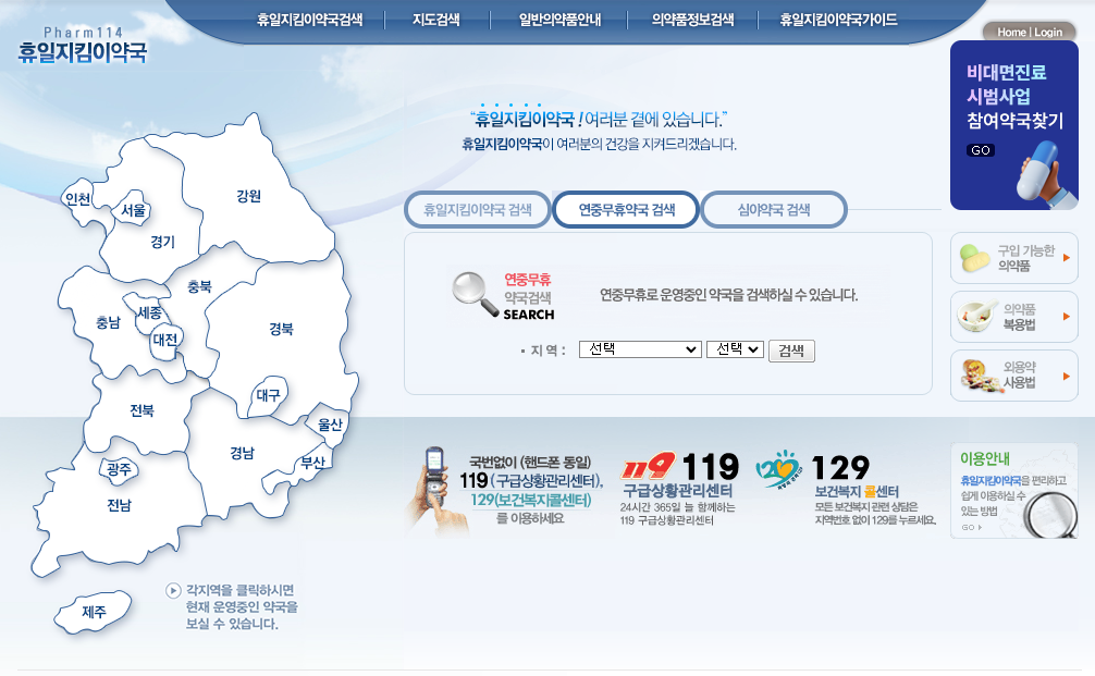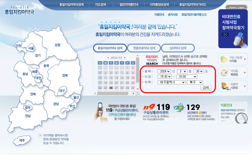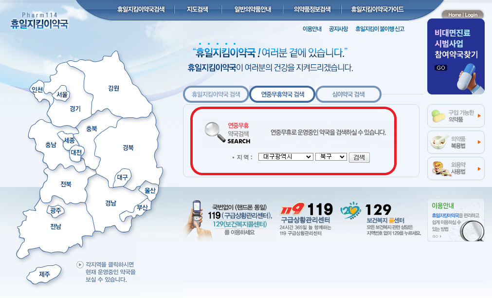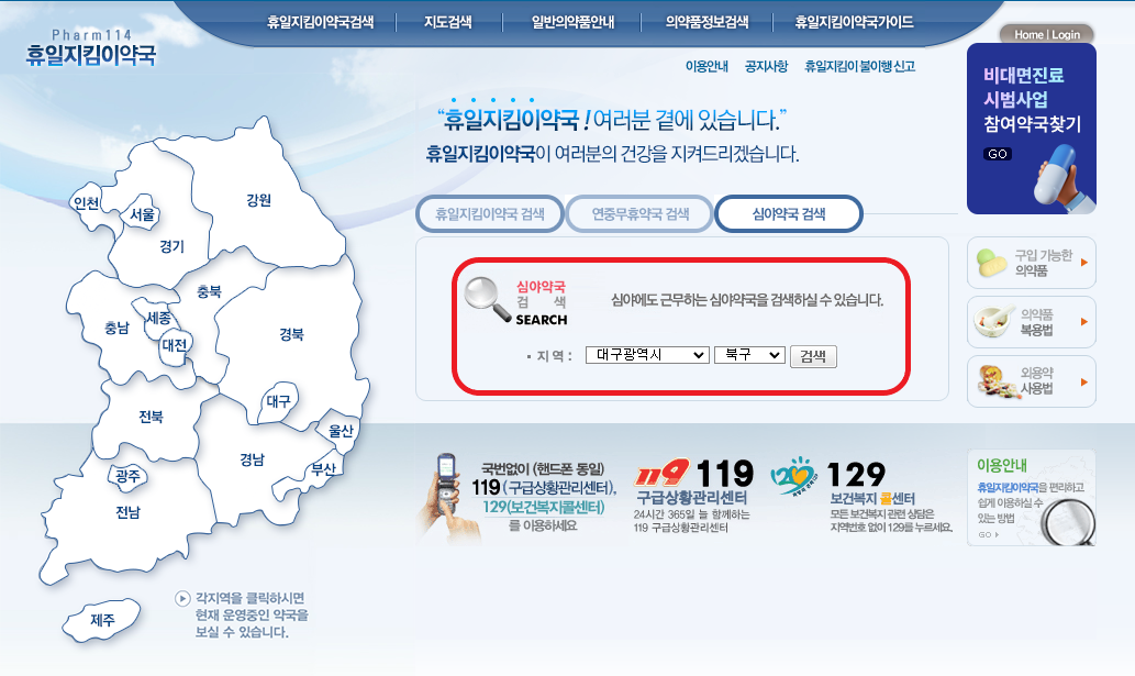 이 외에도 인터넷 사용이 어려운 분들은 129, 119에 전화하여 비상 진료를 운영하는 약국을 물어보면 자세히 안내해주니 참고하기 바란다.