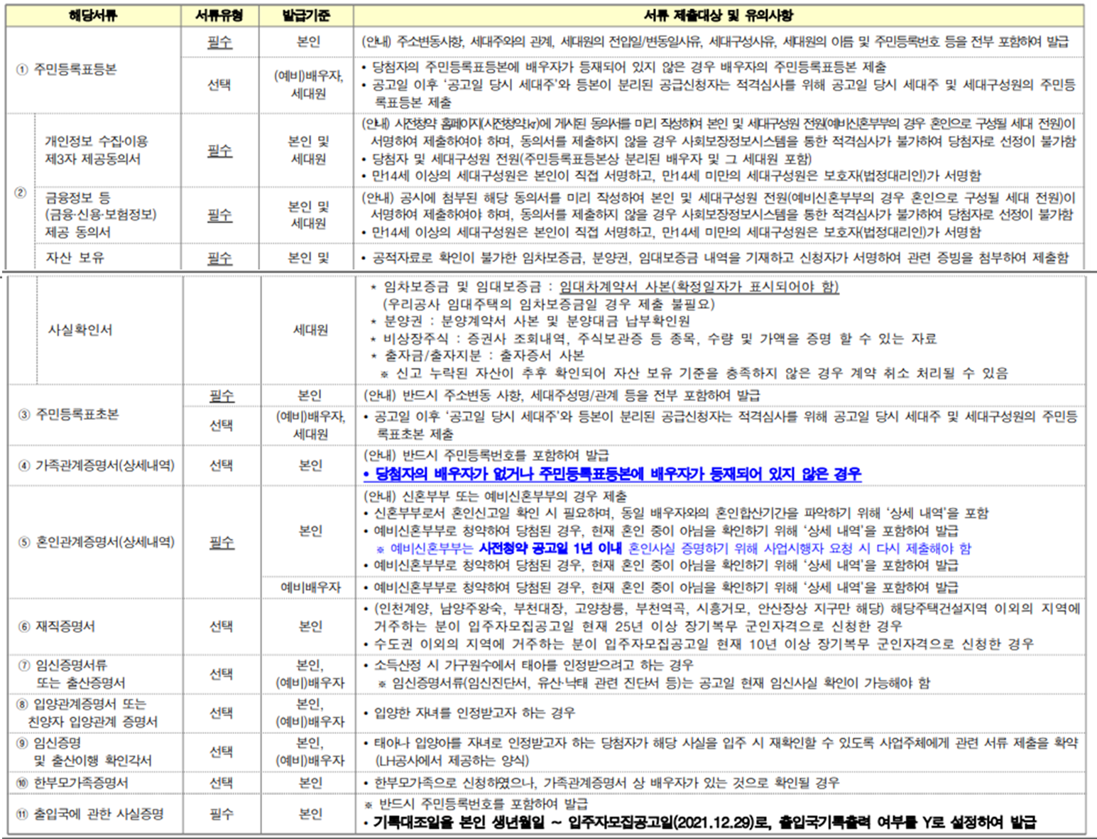 청약을 신청하여 당첨이 된 경우 토지주택공사에 제출해야할 서류들이 있습니다.