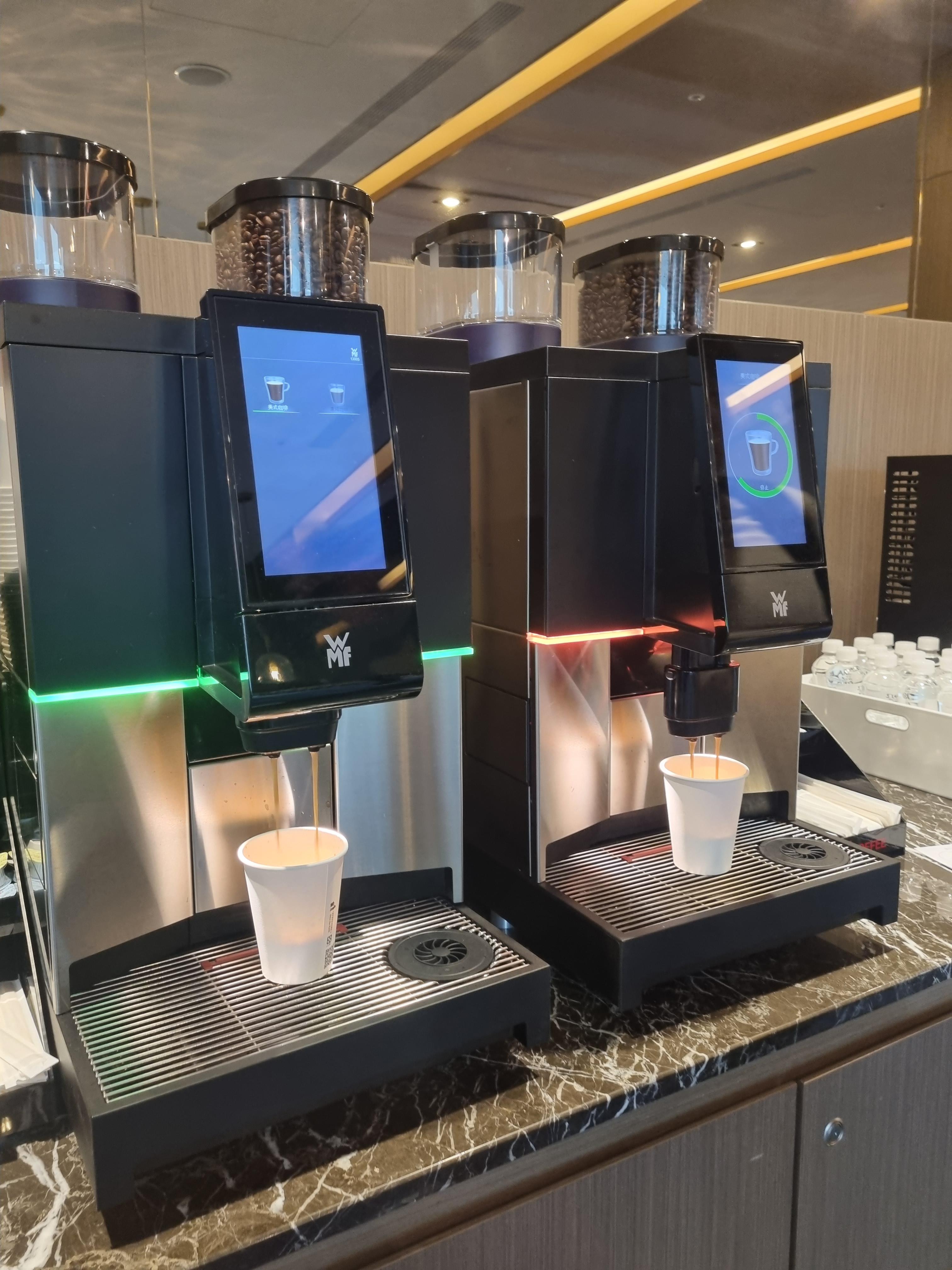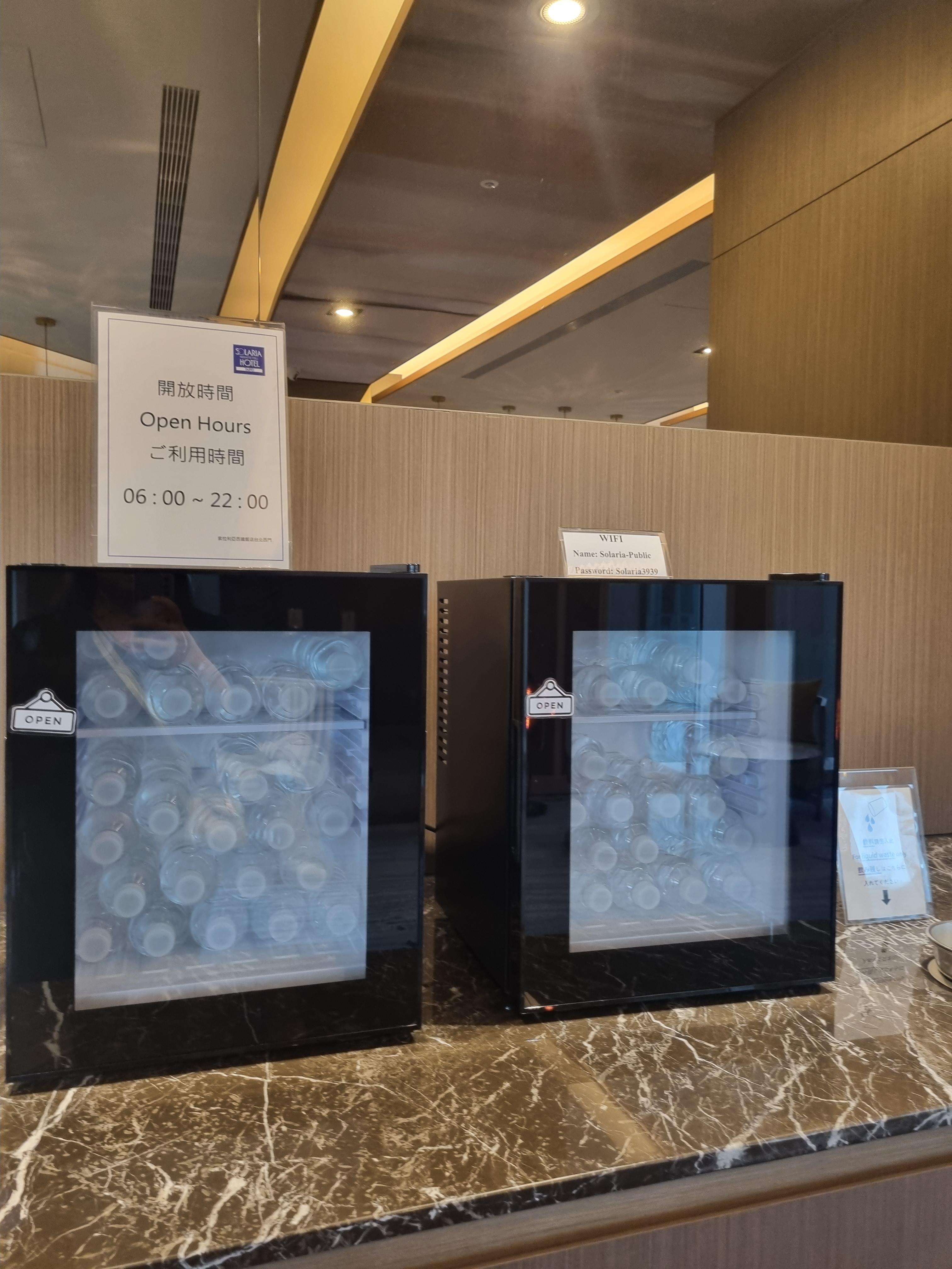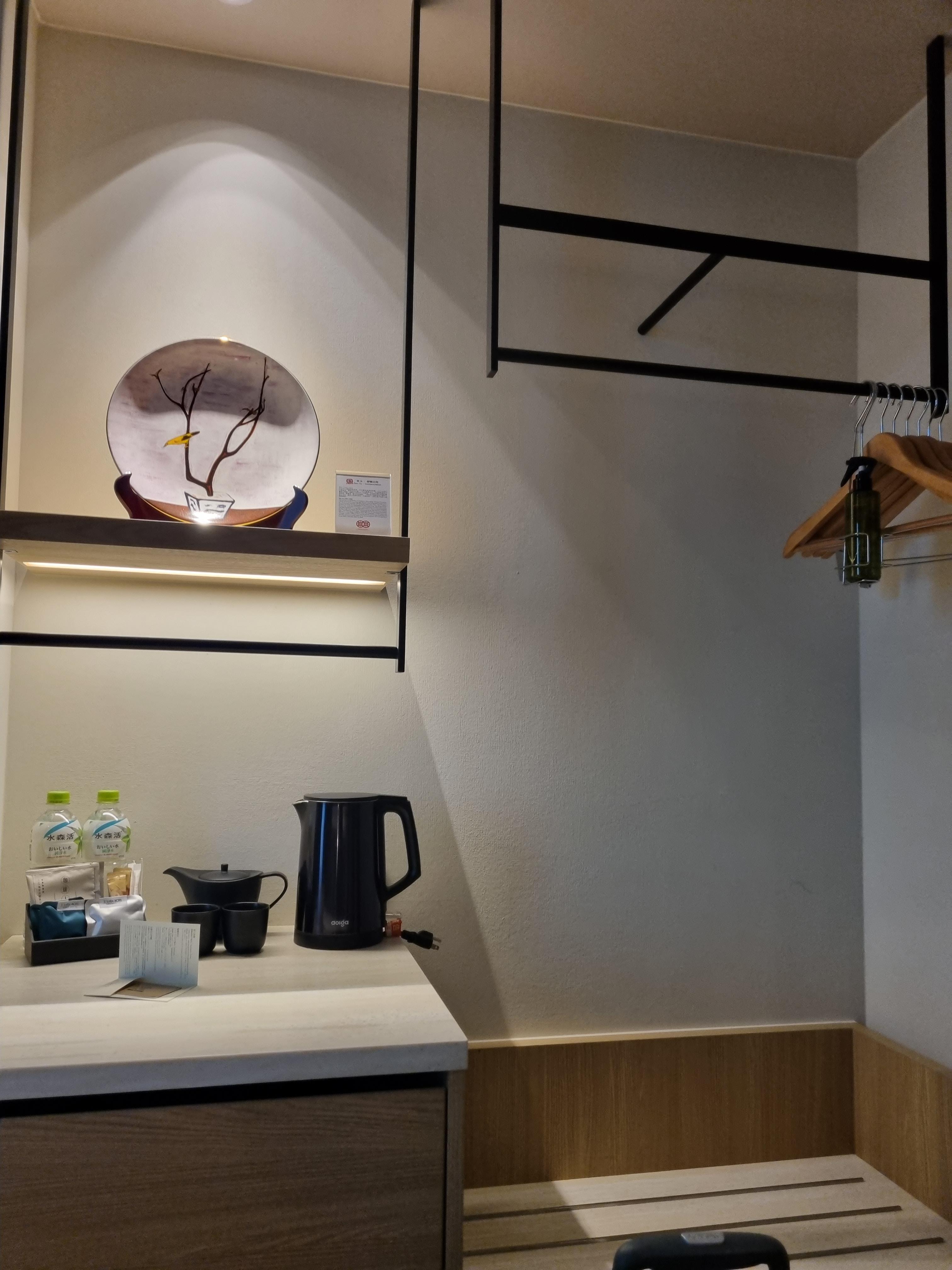 여러가지 차도 있고 커피머신도 있고 물도 쌓여있다