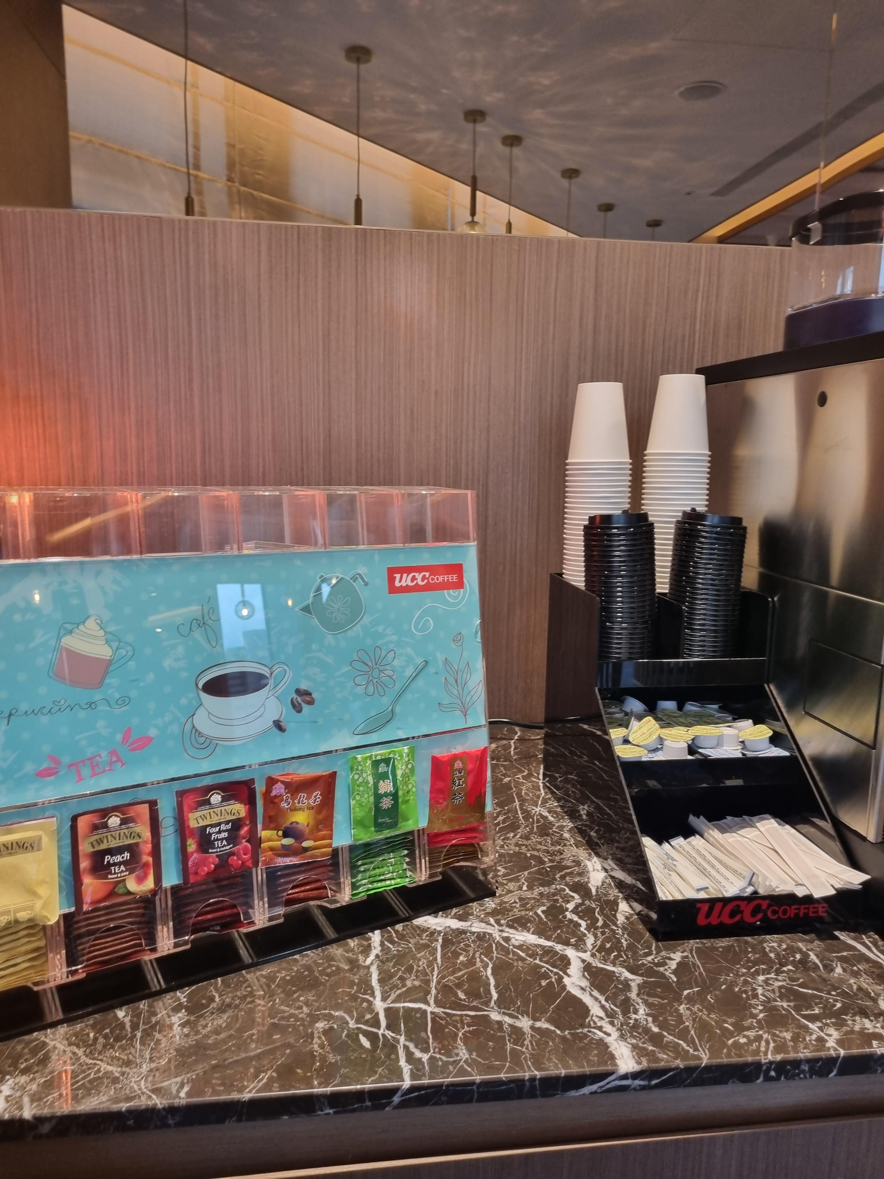 여러가지 차도 있고 커피머신도 있고 물도 쌓여있다